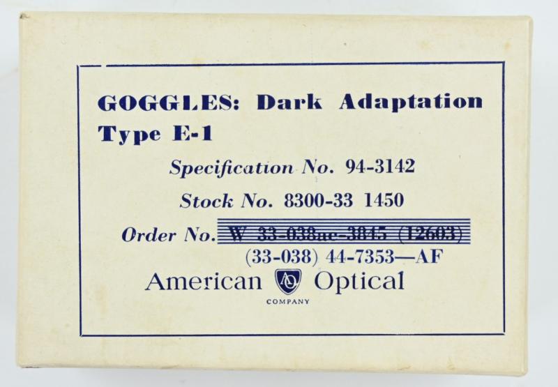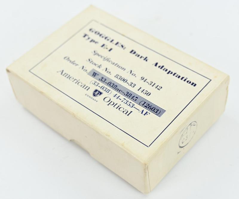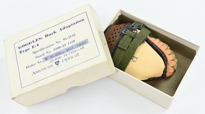 In a very good near mint condition an USAAF Type E-1 Goggles in it's original case. The case is nicely dated 1944 and were made by the American Optical Company. A very nice set in a never used condition.