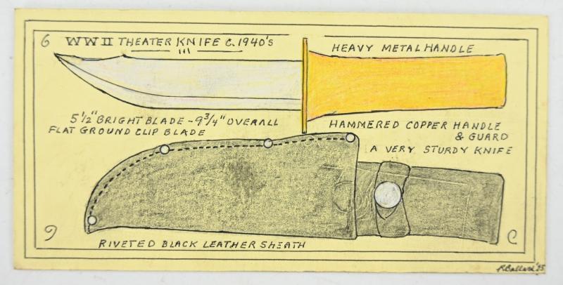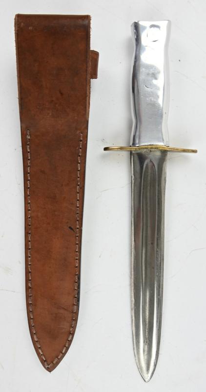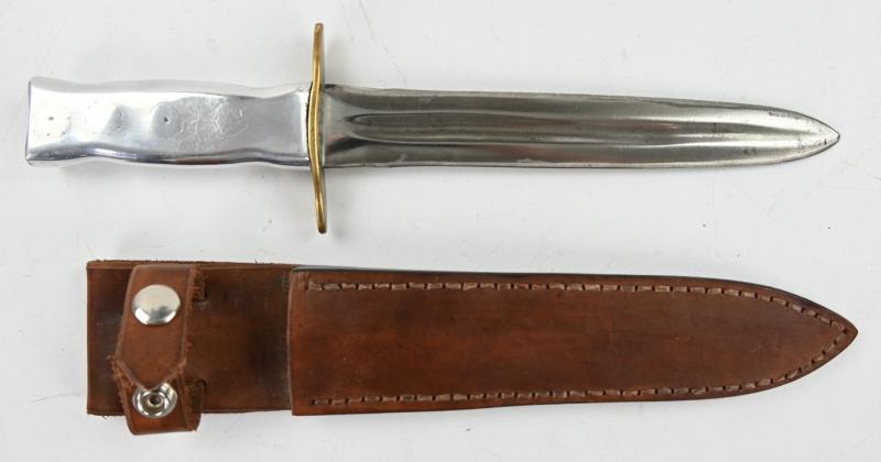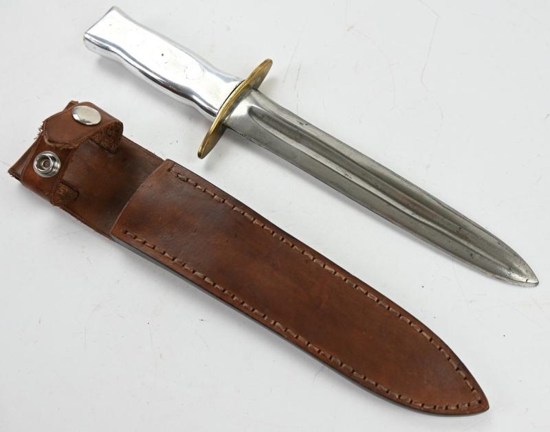 In a very nice condition a US WW2 Theather Made Dagger with scabbard. The set comes with a blade of 5,5inch and is one of the theather made ww2 fighting knives! A very stunning example!