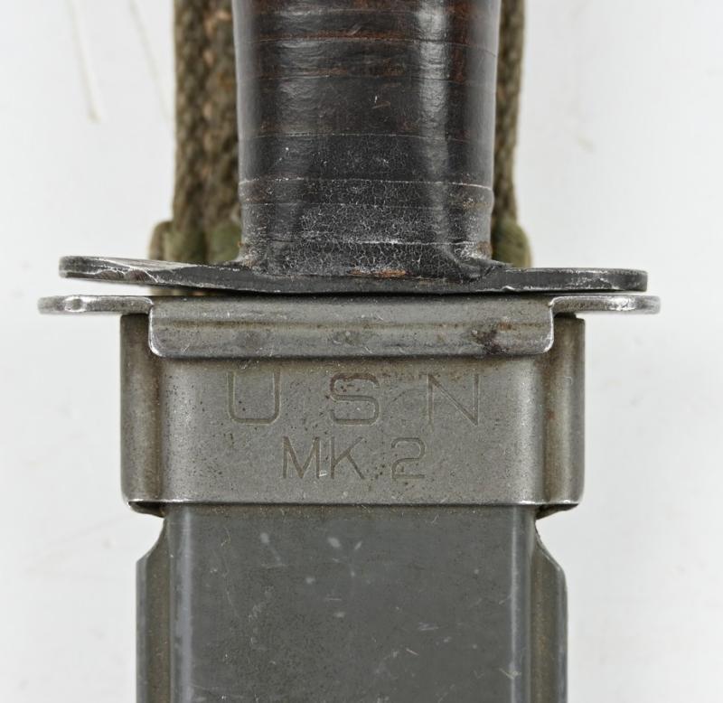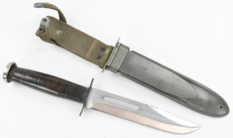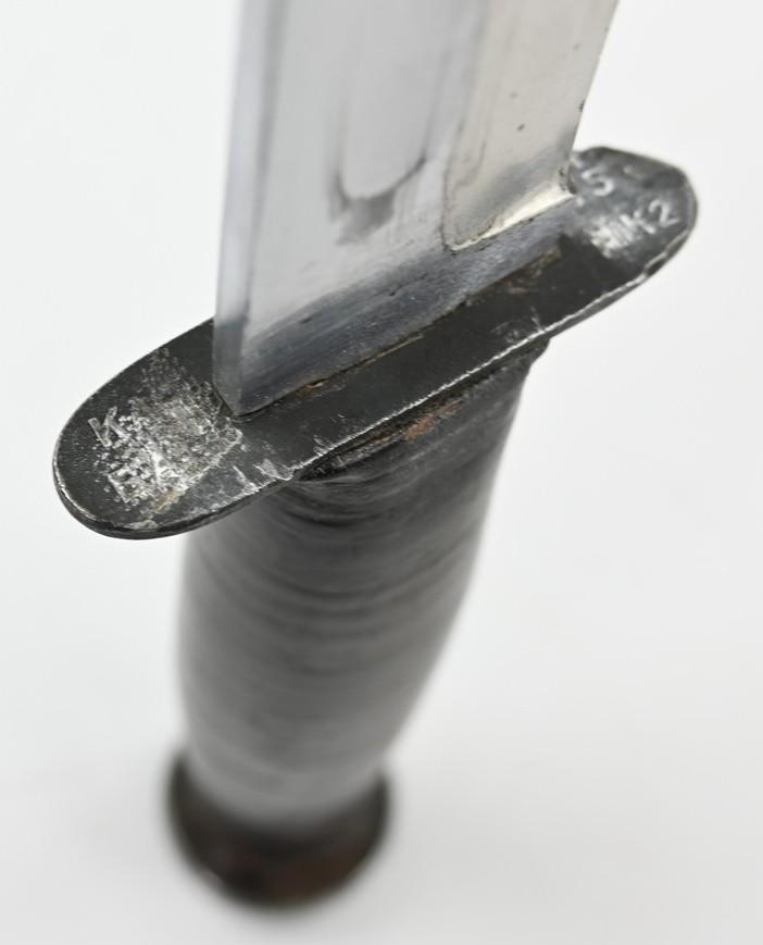In a very nice condition a US WW2 Navy MK2 Fighting Knife. The Kabar knife is nicely maker marked on the crossguard and is complete with scabbard!