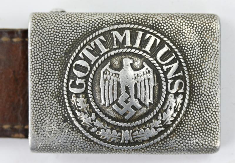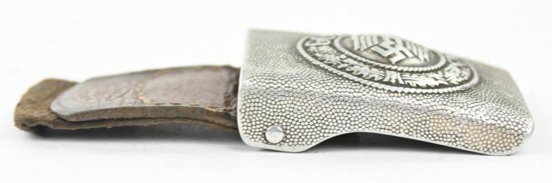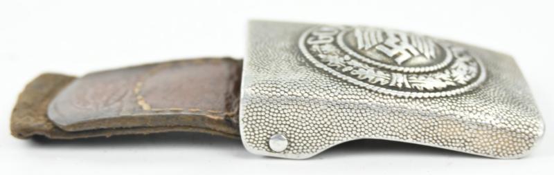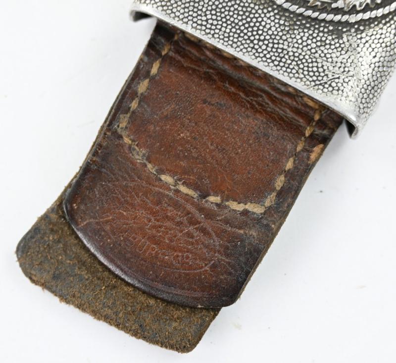 In a very nice condition a German Wehrmacht Aluminium beltbuckle with leather tab. The beltbuckle is nicely maker marked by Nowa Hamburg and 1938 dated.